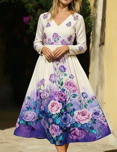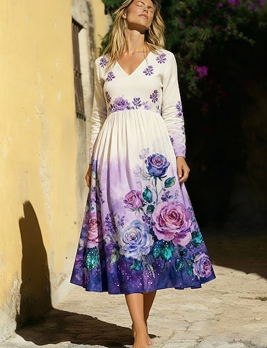 Per donna Abito Lungo Maxi Abito Vestito Casual Abito Stampato Elegante Moda Classico All'aperto Vacanza Ferie Vestibilità regolare Fiore Manica Lunga Scollo a V Bianco Viola Autunno
