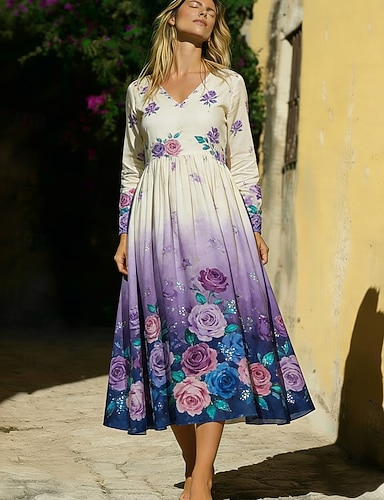 Per donna Abito Midi Abito Boho Vestito Casual Moda Quotidiano All'aperto Vacanza Vestibilità regolare Floreale Manica Lunga Scollo a V Viola Estate Primavera Autunno