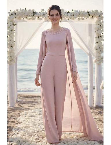 Tuta Completo Pantalone Lunghezza al pavimento Abito da cerimonia per signora Manica 3/4 Collo gioiello Elegante Formale Ospite di nozze Chiffon Pizzo con Perline Applicazioni