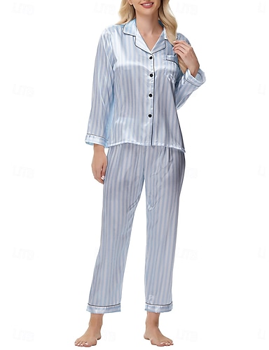 Per donna Abbigliamento da Casa Set Pigiama Moda Semplice Casual A righe Pigiama in raso di seta Elastico in vita Bottoni Pantalone Casa Vacanza Manica Lunga Colletto a Camicia Blu Rosa Primavera