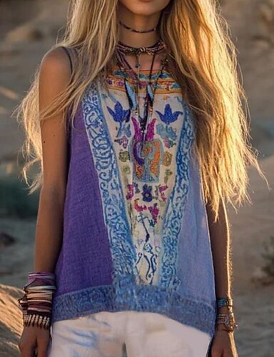 Canotta da donna in lino simile traspirante leggera grafica floreale bohemia quotidiana retro vintage senza maniche scollo a giro top regolari da indossare in vacanza viola estate primavera