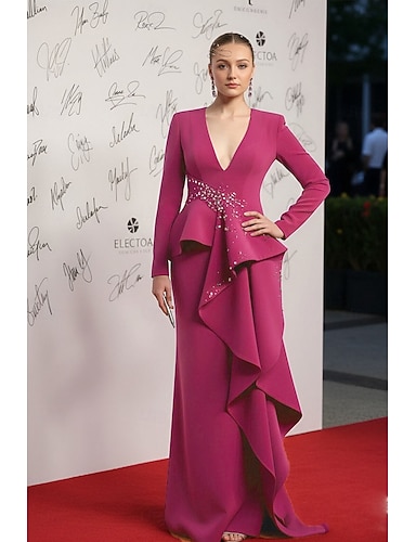 Sirena Tromba Strascico a Terra Abito da invitata a nozze Abiti da Ballo Abito da Sera Da principessa Abito formale Elegante Stile Celebrità Manica Lunga Scollo a V Matrimonio Formale Raso
