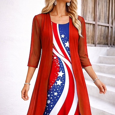 Giorno dell'Indipendenza Set Vestito Patriottico da Donna A Line Vestito Elegante Vacanza Grafica Bandiera Stampa A Strati Midi Vestito Maniche Mezze Collo Tondo Quotidiano Blu Bianco Rosso Estate