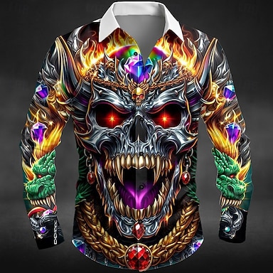 Per uomo Teschio Drago Fiamma Camicia Camicia con Bottoni Manica Lunga Gotico punk oscuro All'aperto Ferie Estate Primavera Collo ripiegato Stampa 3D camicie con colletto Viola Arancione Verde