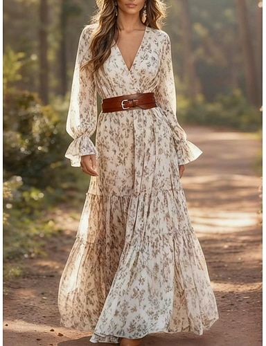 Abito da sera a linea elegante abito formale da matrimonio lungo fino al pavimento maniche lunghe scollo a V in chiffon con stampa floreale abito per gli ospiti di matrimonio