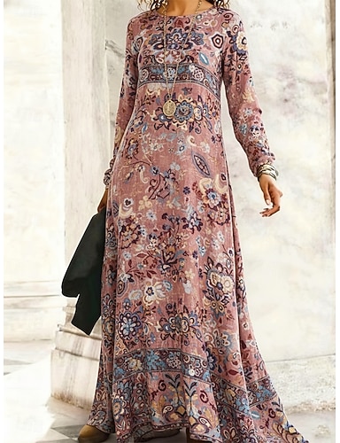Per donna Abito Lungo Maxi Abito Vestito Casual Vestito a ruota Abito Boho Vintage Quotidiano All'aperto Weekend Vestibilità regolare Floreale Manica Lunga Girocollo Rosa Primavera Autunno Inverno