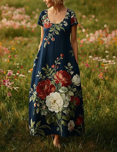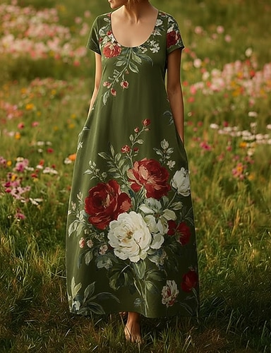 Per donna Abito lungo maxi Abito Boho Vestito Casual Vintage Quotidiano All'aperto Spiaggia Vestibilità comoda Floreale Manica Corta Collo a U Vino Estate Primavera