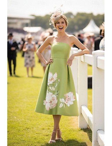 Linea ad A Lunghezza Tè Vestito da Festa Abito da Cocktail Abito da invitata a nozze Abito da cerimonia per signora Manica Corta Senza Spalle Elegante Formale Cocktail party Semi-Formale Raso con
