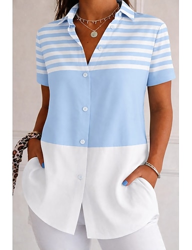 Per donna Blusa Stampato Grafico A righe Vintage Elegante Moderno Manica Corta Collo alla coreana Top Regolari Casuale Quotidiano Blu Rosso Verde Estate Primavera