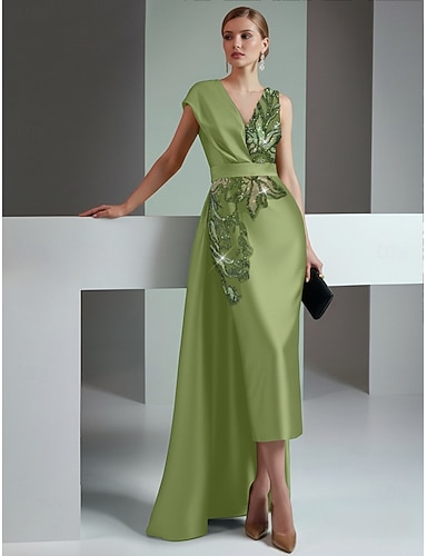 Tuta madre della sposa abito da ospite di matrimonio semplice minimalista spalla unica lunghezza piedi in tessuto stretch di satin maniche corte con arricciature