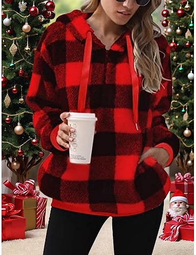 Felpa con cappuccio a fiocco di neve con albero di Natale per donne a Natale grafica geometrico a quadri caldo vintage casual maniche lunghe cappuccio top quotidiani casual stampa patchwork tasca