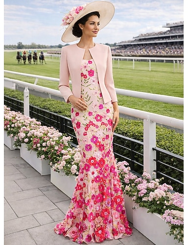Due Pezzi Tubino Colonna Lunghezza al ginocchio Abito Derby Abito da cerimonia per signora Manica Lunga Girocollo Elegante Derby del Kentucky Tessuto Elasticizzato Abiti con Giacca con Tinta unita