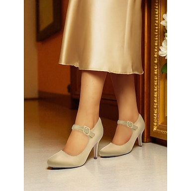 Scarpe con tacco mary jane da donna in raso color champagne con fibbia in cristallo, eleganti décolleté a punta per cocktail party