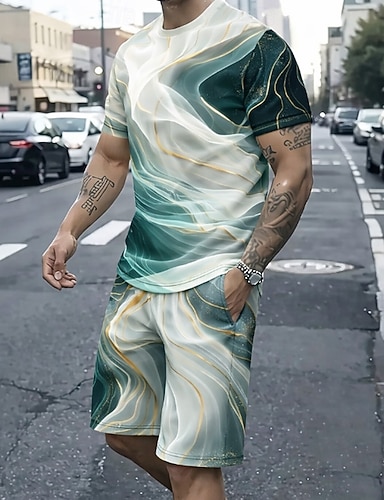 Per uomo Geometrico 2 pezzi Set di magliette Top estivi Manica Corta Pantaloni corti Girocollo Casual Quotidiano All'aperto Vacanza Sport & Outdoor Stampa 3D Estate Blu Viola Verde