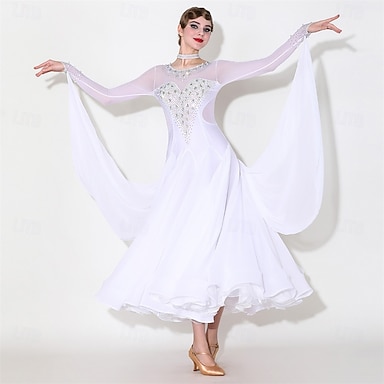 Abito da ballo da sala bianco elegante da donna con corpetto decorato con strass, abito da competizione per valzer, tango, rumba moderna