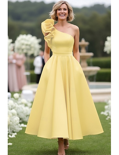 Linea ad A Lunghezza alla caviglia Vestito da Festa Abito da Cocktail Abito da invitata a nozze Abito da cerimonia per signora Manica a Cappuccio Monospalla Elegante Raso con Volant