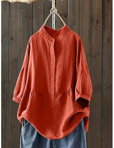 Per donna Blusa Finto cotone e lino Bottoni Tinta unica Elegante Casual Manica Lunga Collo Alto Top Regolari Quotidiano Blu Nero Bianco Rosso Grigio Primavera