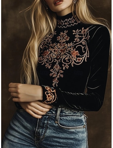 Per donna Velluto Blusa Ricamato Floreale Elegante Essenziale Classico Manica Lunga Collo Alto Top Regolari Quotidiano Ferie Uscire Nero Estate Primavera Autunno
