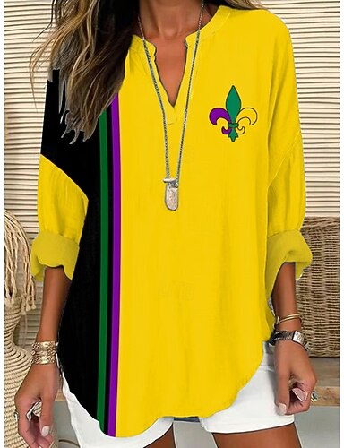 Blusa da Donna per il Mardi Gras in Lino Leggero Traspirante Grafica Vintage Stile Quotidiano Manica Lunga Collo a V Normale Top Quotidiani Stampa Gialla Viola Verde Estate Primavera