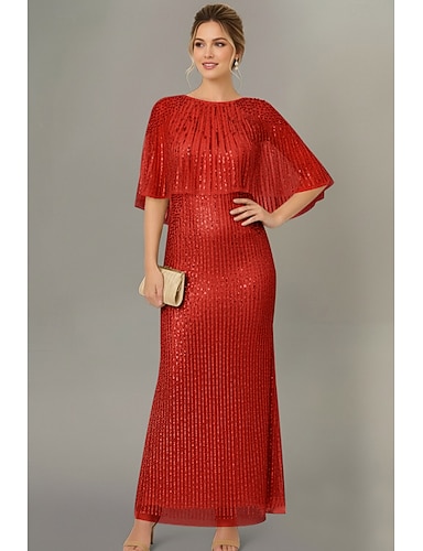 Linea ad A Lunghezza al pavimento Abito con Paillettes Perline ricamate Abito da invitata a nozze Abito da cerimonia per signora Manica Corta Girocollo Elegante Brillare & Splendere Formale Con
