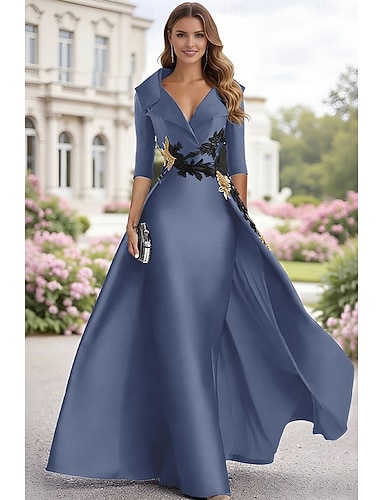Linea ad A Lunghezza al pavimento Abito da Sera Elegante Manica 3/4 Colletto a Camicia Formale Raso con Applicazioni