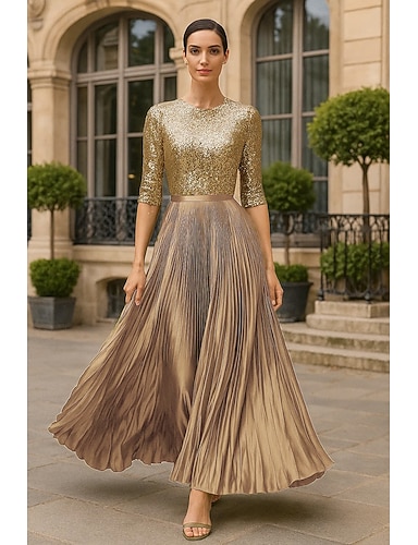 Linea ad A Lunghezza al pavimento Abito da Sera Elegante Scintillante Brillanti Manica 3/4 Scollo a Barca Festa in giardino Matrimonio Raso Con Paillettes con Pieghe