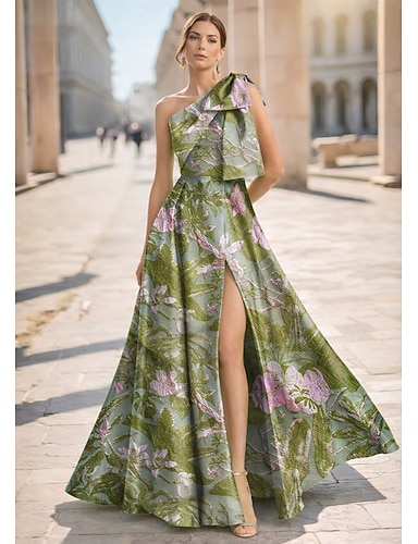 Linea ad A Lunghezza al pavimento Abito da Sera Elegante Stile Celebrità Setoso Senza Maniche Monospalla Festa in giardino Matrimonio Raso con Stampa floreale Fiocco/Fiocchi Pieghe