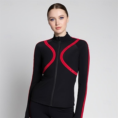 giacca in pile per pattinaggio artistico, giacca da pattinaggio sul ghiaccio da donna e da ragazza, top rosso patchwork elastico allenamento competizione abbigliamento da pattinaggio classico