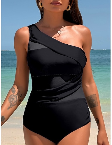 Costume da bagno intero da donna Arricciato Monokini Mesh Controllo della pancia Alta vita Slim Senza schienale Elegante Abbigliamento in vacanza Colore uniforme Halter Neck Senza maniche
