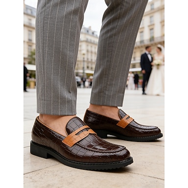 mocassini da uomo marroni con stampa coccodrillo: eleganti scarpe slip-on dal design alla moda, ideali per l'ufficio, le occasioni formali, le uscite informali e i matrimoni