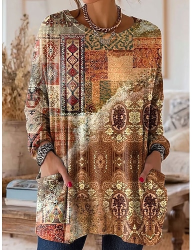 Per donna Maglietta Tasca Stampato Floreale Grafico Vintage Moda Elegante Manica Lunga Girocollo Top Regolari Quotidiano Uscire Weekend Rosa Arancione Verde Beige Primavera Autunno Inverno