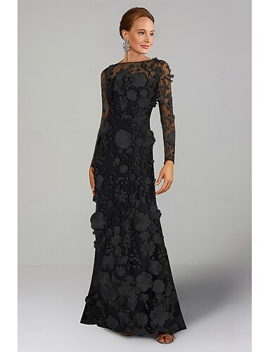 Abiti da sposa per ospiti in spiaggia con applicazioni in pizzo ricamato nero abiti formali semi-formali tubino colonna girocollo manica lunga lunghezza da terra tulle abiti da sposa