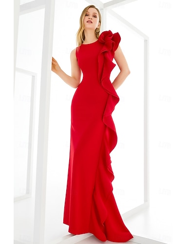 Tubino Colonna Lunghezza al pavimento Abito da Sera Elegante Senza Maniche Girocollo Matrimonio Formale Tasca Crepe Elasticizzato con Volant