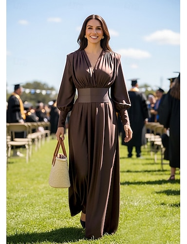Linea ad A Lunghezza al pavimento Abito da invitata a nozze Abito Formale Abito da sera Abito da cerimonia per signora Manica Lunga Scollo a V Elegante Formale Ospite di nozze Raso con Fascia