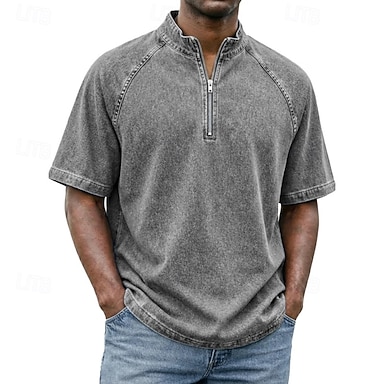 Per uomo Polo con zip Camicia lavata Casuale Bavero Zip a un quarto Manica Corta Vintage Tinta unica Patchwork angosciato Estate Primavera Tutte le stagioni Vestibilità regolare Esercito verde Nero