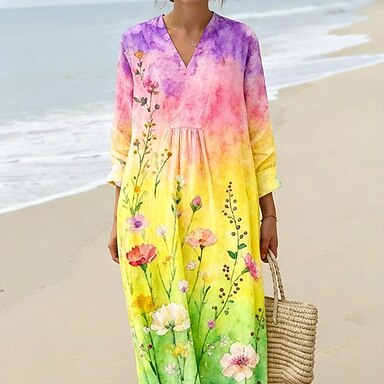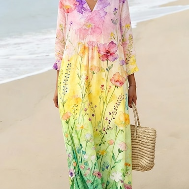 Per donna Abito Midi Vestito Casual Abito a Tubino Moda Moderno Quotidiano All'aperto Vacanza Vestibilità regolare Floreale Multicolore Manica Lunga Scollo a V Giallo Estate Primavera Autunno