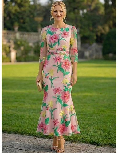 Tubino Colonna Lunghezza alla caviglia Vestito da Festa Abito da Cocktail Abiti da Cocktail Elegante Vintage Floreale Manica 3/4 Girocollo Formale Ospite di nozze Organza con Fiore ricamato Arricciato