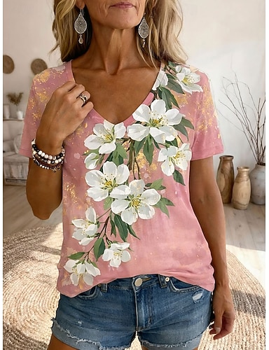 Per donna Maglietta Stampato Grafico Piante Vintage Elegante Casual Manica Corta Collo a V Top Regolari Quotidiano Uscire Weekend Blu Viola Verde Cachi Estate Primavera