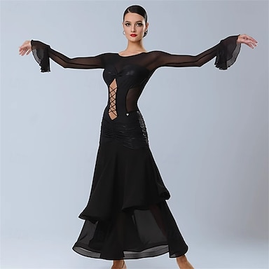 abito da ballo da sala da donna in rete nera, maniche lunghe, allacciatura frontale, chiffon, maniche a campana, sexy, vestito da spettacolo di tango, rumba, paso doble