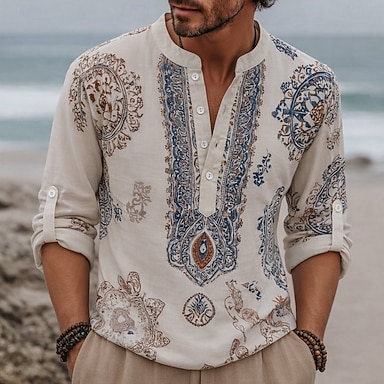 Per uomo Etnico Camicia Camicia con Bottoni Maglia Henley Manica Lunga Casual Tribale Quotidiano Vacanza Estate Primavera Autunno Senza colletto Scollo a V Stampato Cachi