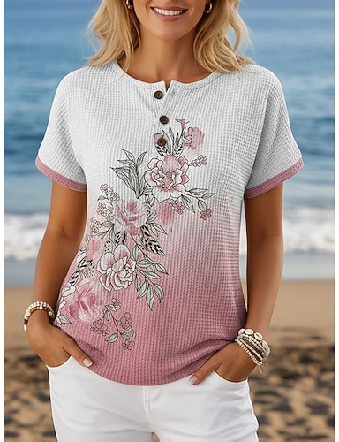 Per donna Maglietta Stampato Bottoni sul petto Floreale Grafico Elegante Moderno Casual Manica Corta Henley Top Regolari Quotidiano Blu Giallo Rosa Viola Verde Estate Primavera