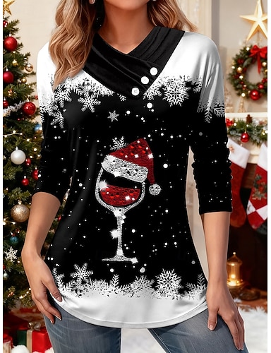 Natale Per donna Maglietta Grafico Fiocco di neve Elegante Casual Manica Lunga Scollo a V Top Regolari Quotidiano Bottoni Stampato Asimmetrico Nero Rosso Verde Autunno Inverno