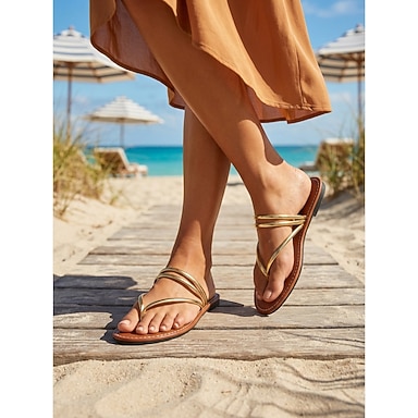 Sandali infradito dorati chic da donna - infradito basse minimaliste con cinturini metallici per vacanze al mare e resort estivi &Relax a bordo piscina