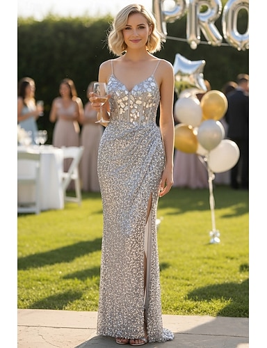 Linea ad A Tubino Colonna Lunghezza al pavimento Abito da Ballo Vestito da Festa Abito da invitata a nozze Abiti per invitati a matrimoni Elegante Festa Scintillante Senza Maniche Spalline sottili