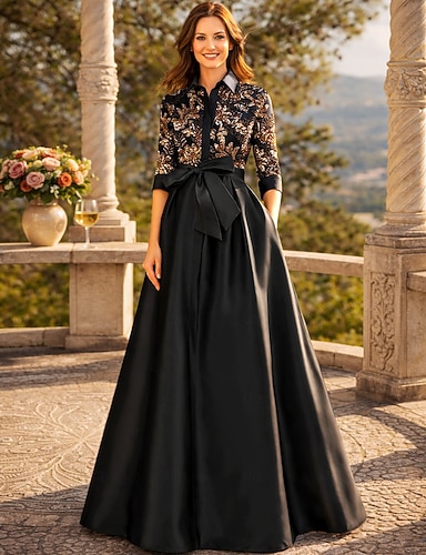 Linea ad A Lunghezza al pavimento Abito in Raso Abito da invitata a nozze Abito Formale Abito da cerimonia per signora Manica 3/4 Colletto a Camicia Elegante Vintage Formale Ospite di nozze Chiesa