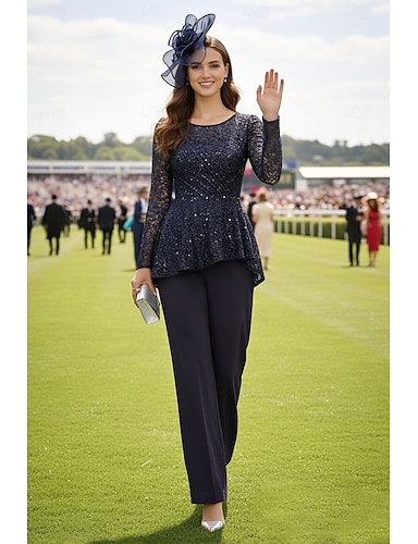 Due Pezzi Tuta Completo Pantalone Lunghezza al pavimento Abito da cerimonia per signora Manica Lunga Scollo Tondo Elegante Formale Ospite di nozze Serata Formale Chiffon Pizzo con Paillettes