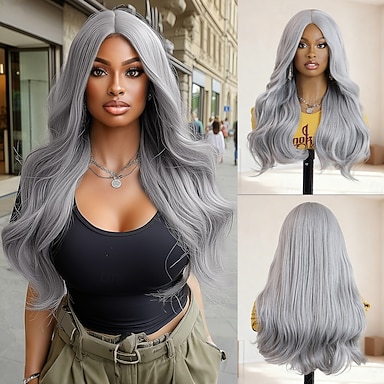 Parrucche lunghe da donna con effetto sfumato grigio e ondulate, con radice nera, da 26 pollici, in fibra sintetica resistente al calore, dall'aspetto naturale, per l'uso quotidiano alle feste