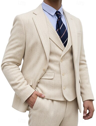Uomo Abiti da lavoro Casuale Affari Nero Beige Autunno & Inverno Tuta Bavero classico Affari Spina di Pesce Vestibilità su misura 3 pezzi Doppiopetto a sei bottoni