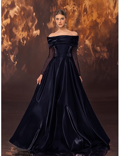 Abito da ballo Lunghezza al pavimento Abiti da Ballo Elegante Vintage Setoso Manica Lunga Scollo a Cuore Balli di fine anno Matrimonio Raso Tulle con Glitter
