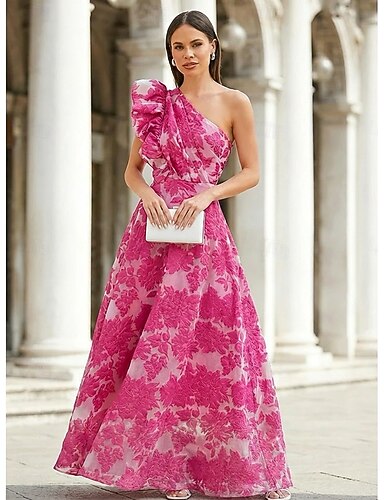 Linea ad A Lunghezza al pavimento Abito da Sera Elegante Vintage Floreale Senza Maniche Monospalla Formale Ospite di nozze Tasca Raso Jacquard con Fiore ricamato
